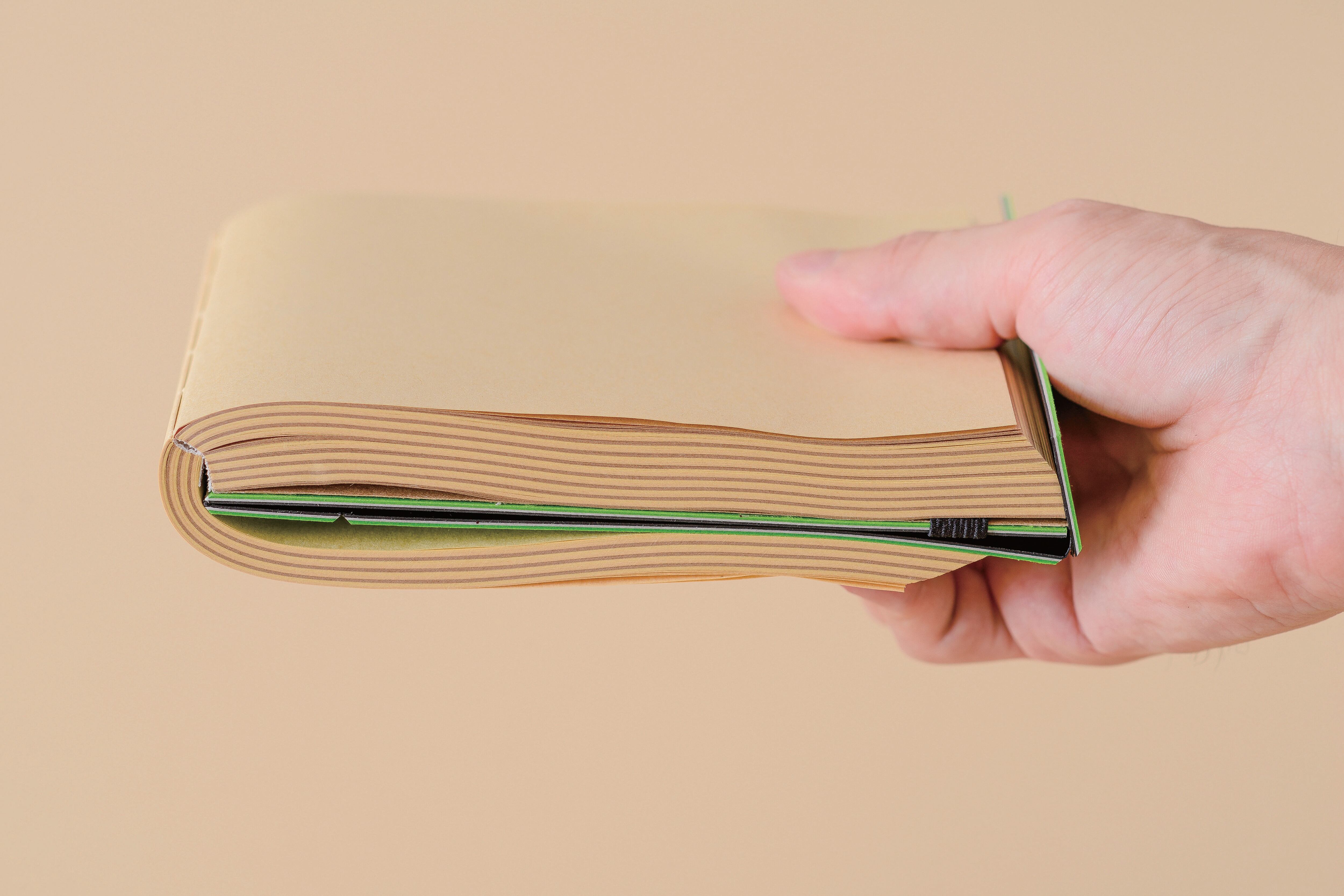 常に新しい気持ちでノートに向かえるように、本文の紙は地層に見立てた3種類のクラフト紙を8枚ごとに切り替えています。